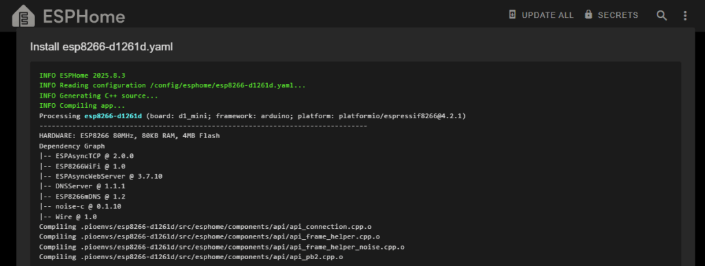 just a few days after I published the article, Home Assistant released a new update of ESPHome. As shown below, it’s remarkably easy to flash the Arduino with a fresh firmware — including all updated libraries — over a pure wireless connection. Fast, simple, effective.