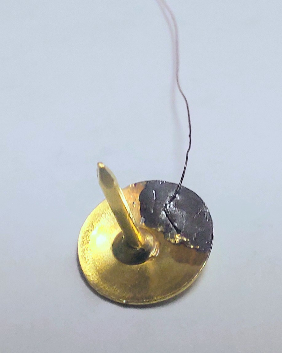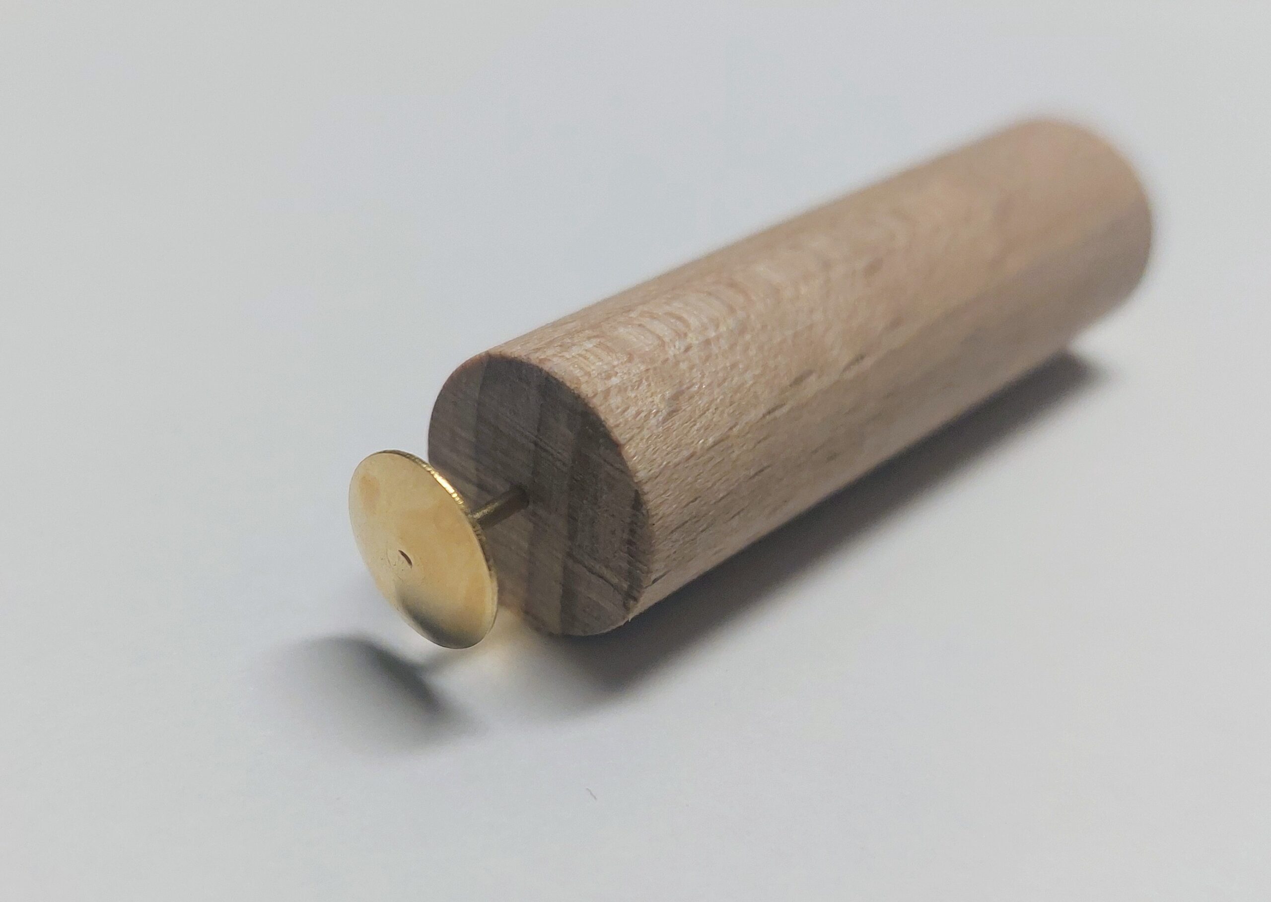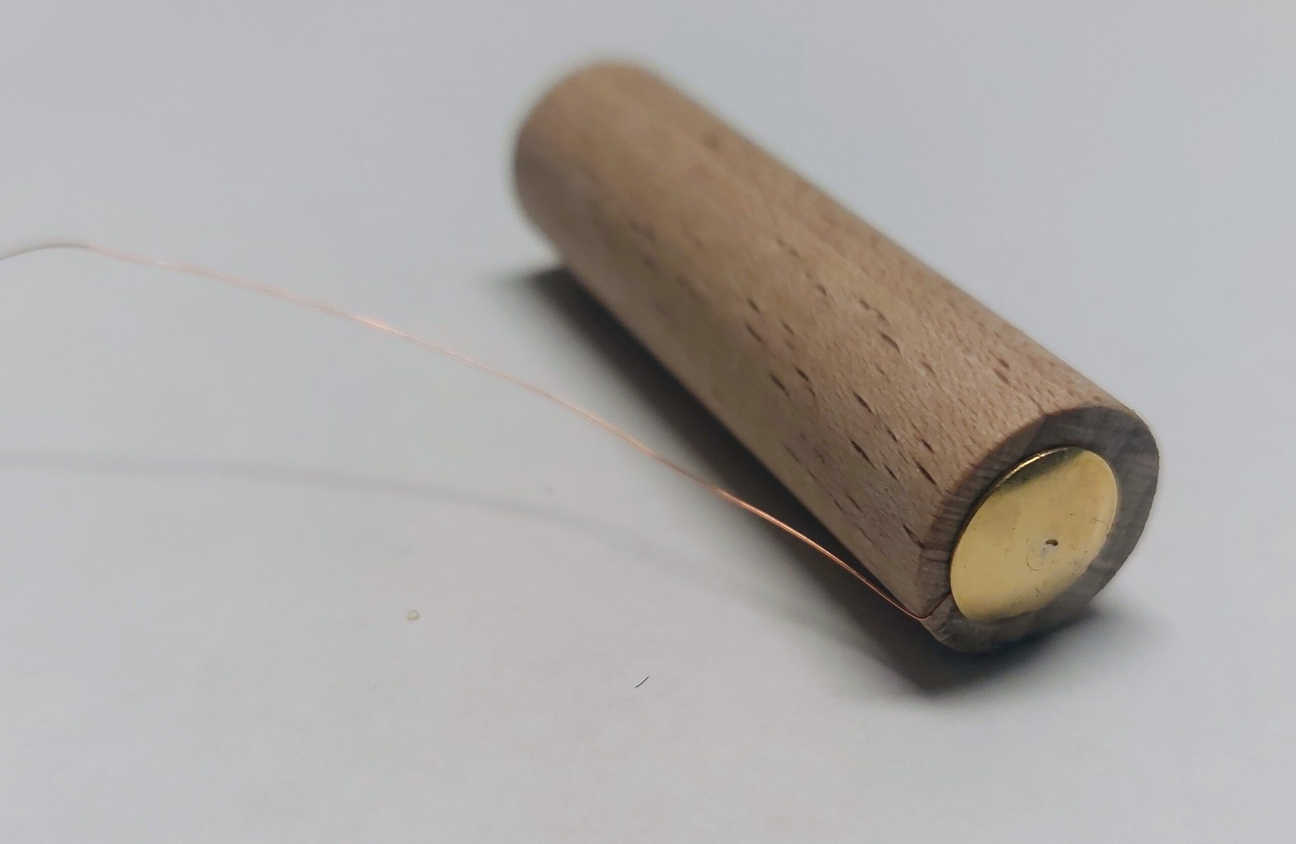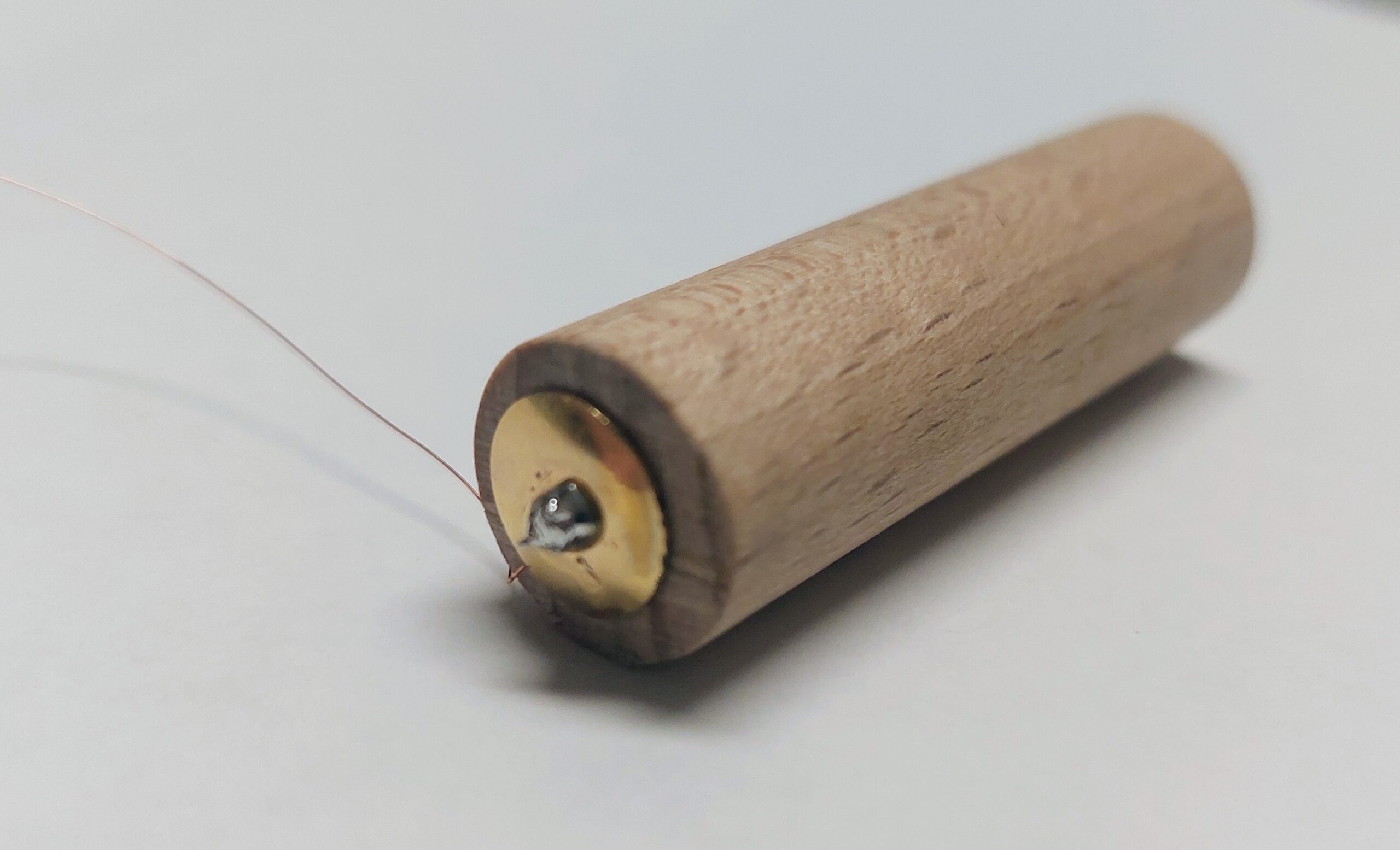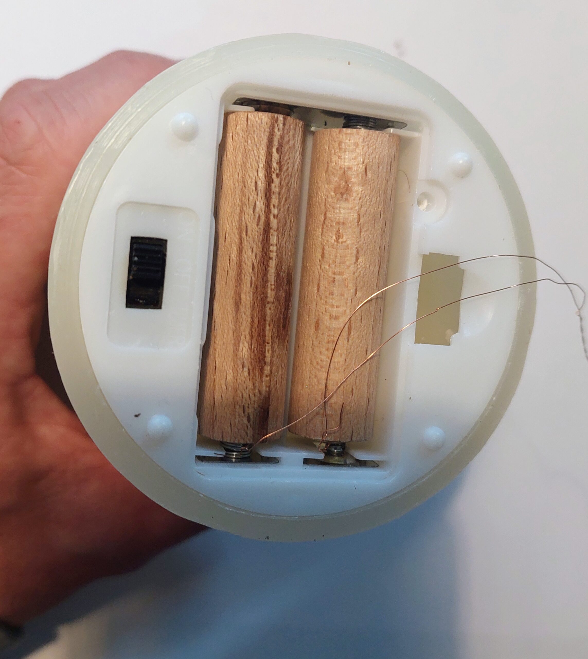 For these contacts, I used drawing pins, soldering enamelled copper wire1 to each pin before inserting them into the pre-drilled holes. The pins sit firmly, provide clean electrical contact, and keep the wiring secure. Once assembled, the wooden dummy fits smoothly into the candle’s battery compartment and offers a reliable external power connection without needing any batteries at all.