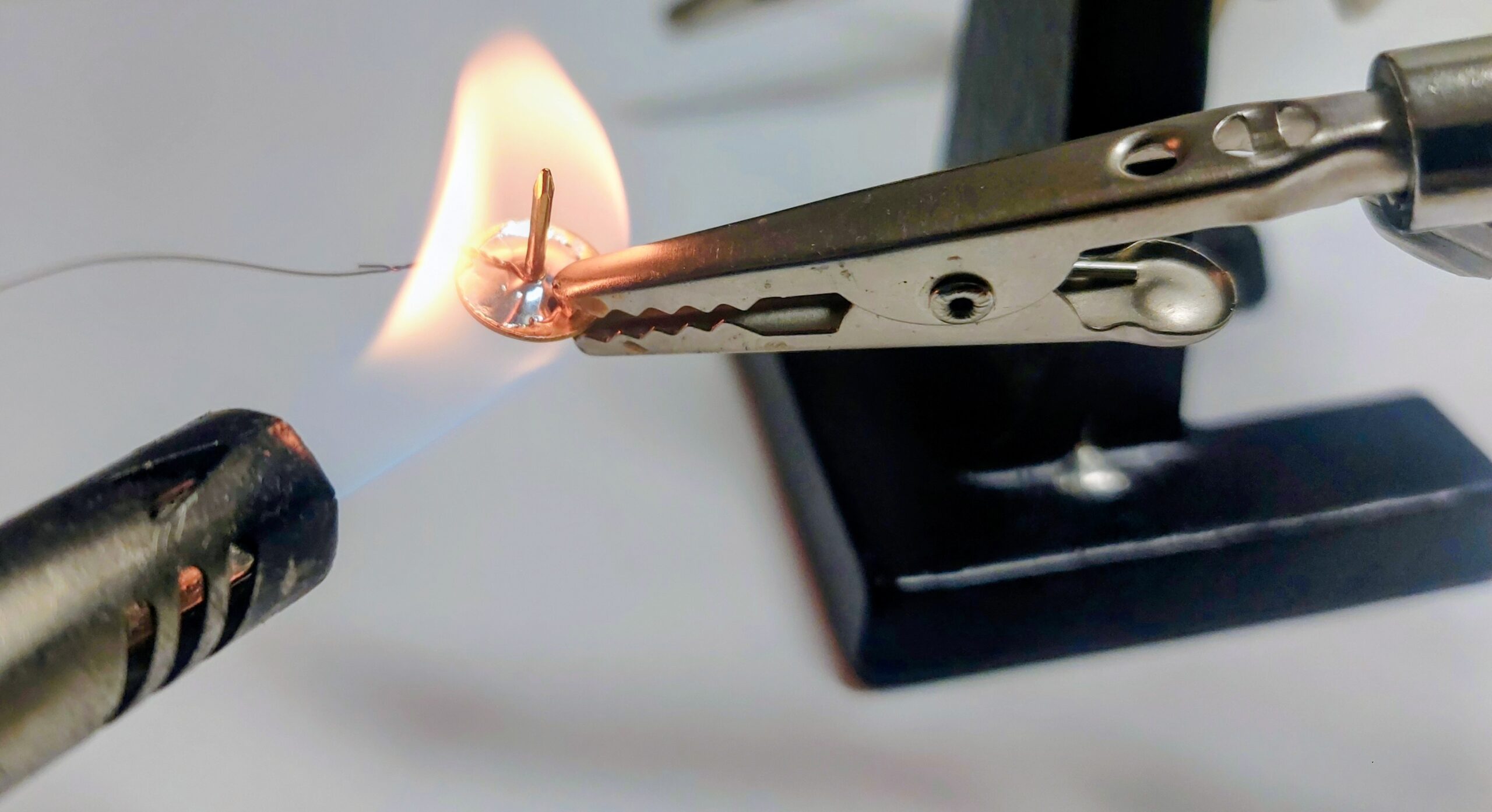 For very thin enamelled copper wire, a practical way is to twist it a few times to get a stable bundle, then burn off the insulation with a lighter and tin it afterwards. It takes some practice because the wire is fragile and the enamel does not always melt evenly, but once tinned it is much easier to solder.
