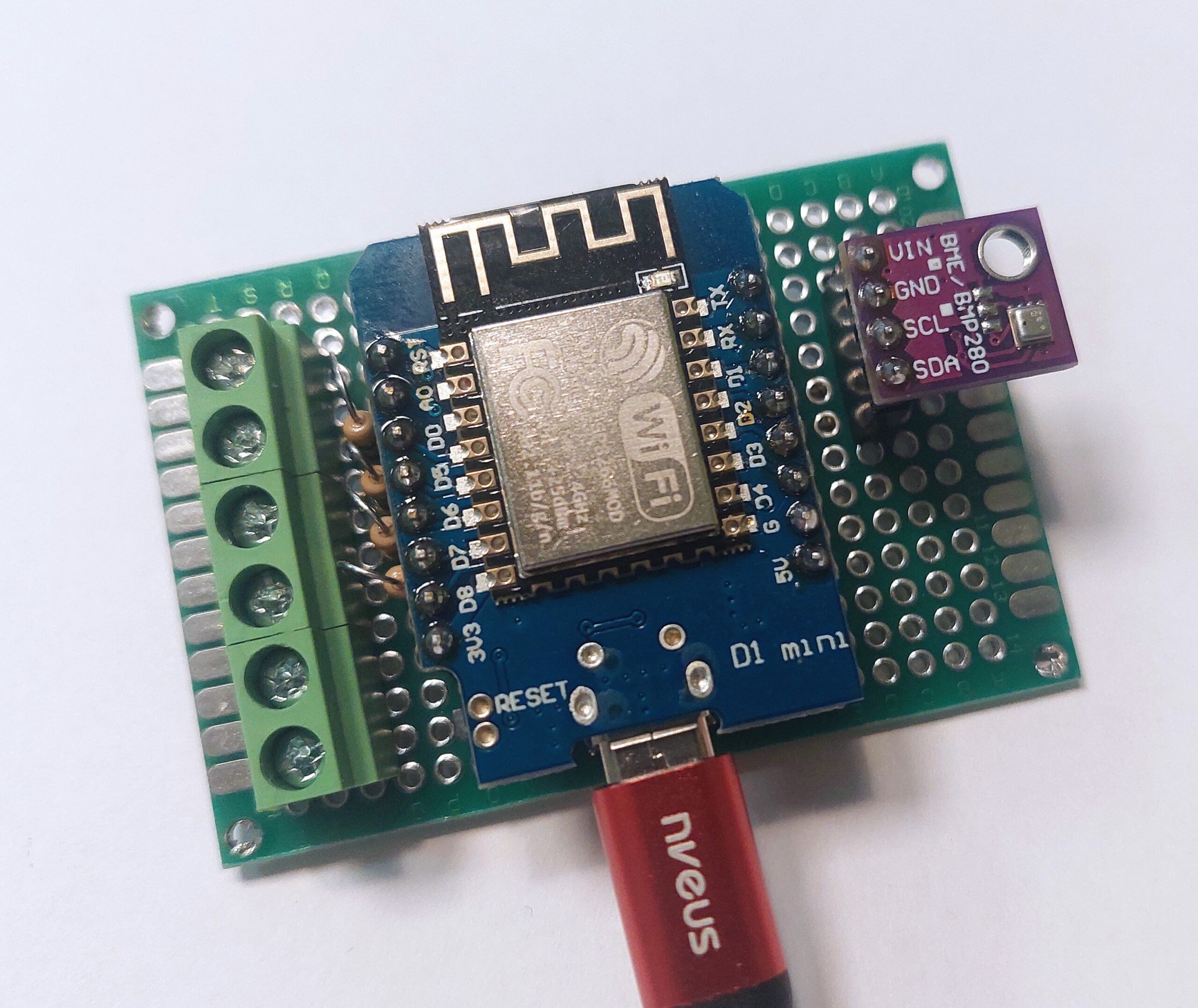 To add environmental metrics, a BME280 (I²C) sensor was introduced. It runs on 3.3 V only, so no regulator or level shifting is required when operating alongside the D1 Mini. SCL and SDA are routed to the right-side header pins to keep the signal path short and accessible: