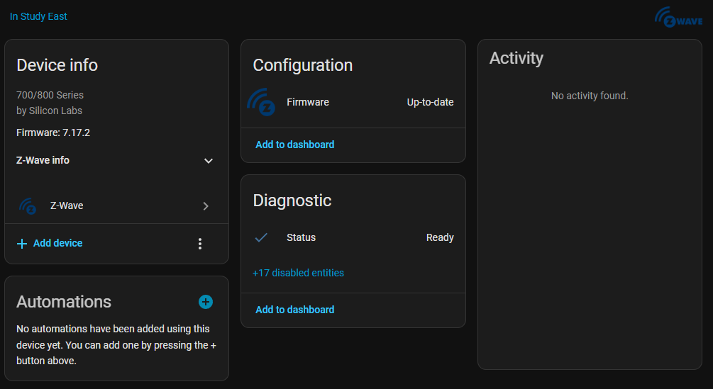 You should see your Z-Wave controller listed as Connected with details such as firmware version and controller ID.