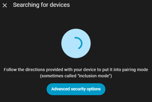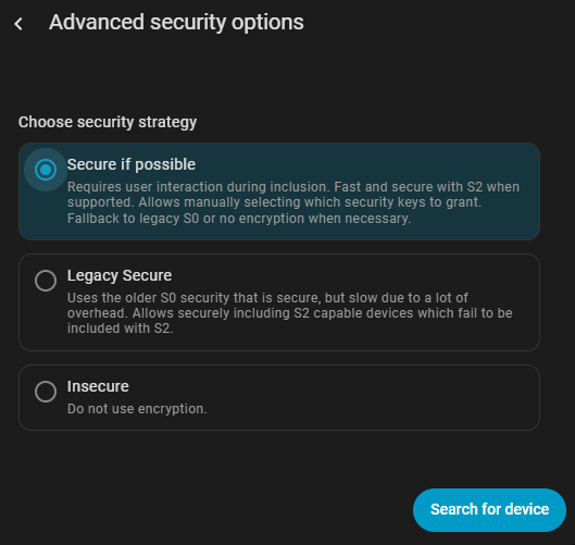 - The previous Searching for devices dialogue box reappears, but this time without the blue button and with a note stating Inclusion strategy: Secure if possible.