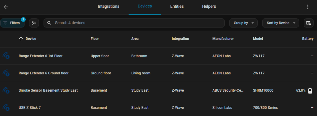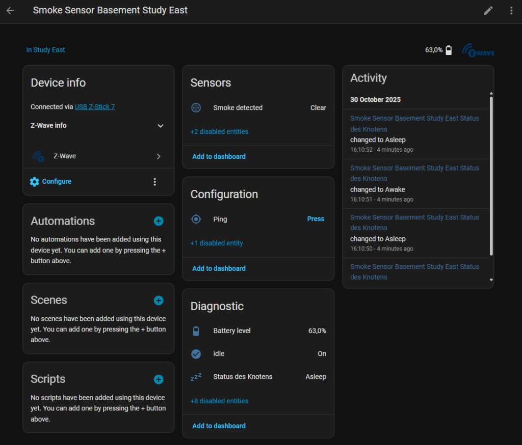 By replacing the unreliable ABUS gateway with Home Assistant and an Aeotec Z-Stick 7, the Z-Wave network becomes stable and predictable. All smoke detectors communicate reliably, and notifications are handled entirely through Home Assistant automations. The Aeotec Range Extender 6 units improve network coverage and ensure every device stays connected. You now have complete transparency over device status, battery levels, and alarm events — all from one interface. In practice, this setup turns a previously fragile ABUS system into a robust, self-managed Z-Wave network that runs quietly and consistently in the background.
