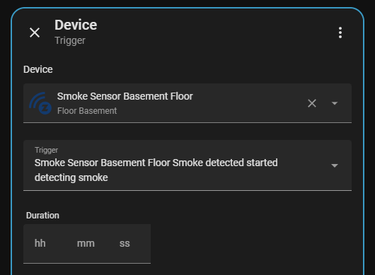 For the trigger, I implemented device triggers and included all of my smoke detectors in the setup. This ensures that the automation will respond individually to each detector, keeping the logic clear and focused on each specific device.