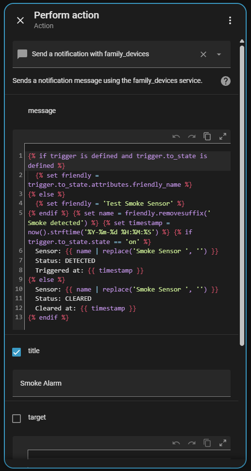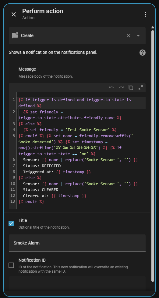 For the action, I defined a clear and isolated response that is executed whenever the trigger fires. This keeps the behavior predictable and ensures that each smoke detector activation leads to the same, consistent reaction.