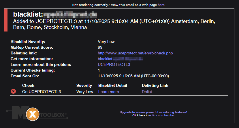 UCEPROTECTL3 listings are common in shared hosting environments. They often rotate in and out automatically and don’t require manual delisting. The key is to monitor mail flow and reputation — not to overreact to an isolated entry in this specific list.